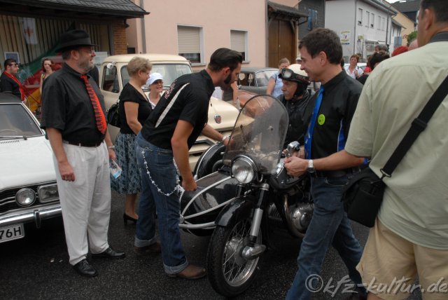 Der Veranstalter Golden Oldies ist stolz von abermals 70000 Zuschauer an 3 Tagen. Hier bei KFZ-Kultur.de sehen Sie 600 Bilder Fotos vom Samstag, den 26.7.2008 Vom 25. bis 27. Juli 2008 in Wettenberg 19. Festival Golden Oldies- Eine hessische Gemeinde auf Zeitreise in die Wirtschaftswunderzeit der 50er und 60er 3 Tage - 9 Bühnen - 50 Livebands - über 1.000 Oldtimer und 70.000 Besucher Musik & Motoren beim Festival Golden Oldies im Schatten der Burg Gleiberg Das mittelhessische Wettenberg wird zum 19. Mail für drei Tage „Deutschlands Hauptstadt der Oldiemusik“. Auf 9 Bühnen präsentieren rund 50 Musikgruppen Schlager, Beat, Soul, und Rock’n’Roll im Schatten der Burg Gleiberg. Eine atemberaubende Zeitreise in die 50er, 60er und 70er Jahre mit Deutschlands größter Oldtimer-Show. Das Motto in diesem Jahr: „Familie, Fortschritt & Souvenirs“ Das Festival hat Kultstatus und gehört zu den TOP Oldtimer Veranstaltungen in der Bundesrepublik. Was vor 18 Jahren mit nur 8 Bands, vier Bühnen und rund 3.000 begeisterten Fans begann, wurde inzwischen von der Fachpresse zu „Deutschlands schönster Oldiefete“ nominiert. Knapp 70.000 Besucher zählte das Festival im vergangenen Jahr. Mit Bus, Bahn und eigenem PKW reisen sie aus der gesamten Bundesrepublik und auch aus dem benachbarten Ausland an, um bei diesem Ereignis dabei zu sein. Golden Oldies bietet gleichermaßen Information und Unterhaltung zur Kulturgeschichte der vergangenen 50 Jahre. Von überregionalem Interesse ist bei Autoliebhabern die Ausstellung der rund 1.000 Klassikfahrzeuge am Sonntag, 27. Juli 2008 zu der private Fahrzeugbesitzer und über 50 Oldtimerclubs eingeladen sind.. Fahrzeuge, die zum Motto „Familie, Fortschritt Souvenirs“ passen, sind in diesem Jahr besonders gern gesehen, denn ihnen wird dieses Mal besondere Aufmerksamkeit gewidmet. Wiedersehen mit meinem ersten Auto: HEINRICH PUMPERNICKEL, alias Chris Howland. Er wird zum 19. Festival nach Wettenberg kommen, um ein Wiedersehen mit seinem 1. Auto zu feiern: Einem DKW 3=6, 2 türig fuhr "Mr. Pumpernickel" in den 50er Jahren Das Programm wird abgerundet durch zahlreiche Aktionen, Ausstellungen, ein umfangreiches Kinderprogramm und durch Deutschlands größten „Nostalgie Markt der 50er Jahre“. In rund 100 Verkaufsständen wird Originalware der sogenannten „Wirtschaftswunderzeit“ angeboten. Petticoats, Tulpenlampen, Schallplatten und Jukeboxen stehen in der Hauptstraße und in der Mehrzweckhalle zum Verkauf. Das Rockmuseum von Maria und Wolfgang Thomas stellt in der Mehrzweckhalle einen Querschnitt aus der Gesamtsammlung aus. Cruising der besonderen Art: Kinderwagen-Parade! Auf vier Rädern, 1 Fahrer(in) und meist nur mit einem Mitfahrer "belegt"... Am Samstag, dem 26. Juli 2008 gibt es ein Cruising der besonderen Art: Der Kostümverleih "Wundertüte" lädt ein, sich im Outfit der 50er/60er und mit einem Kinderwagen dieser Epoche zum Festivals Golden Oldies zu präsentieren und der „Deutsche Petticoat-Wettbewerb“ lädt alle Besucher des Festivals zu einer Zusammenkunft im Outfit der 50er bis 70er Jahre ein. Zusammengestellt wird das Festival von der Peter Turczak eventeam GmbH & Co KG. Unterstützt wird das Festival Golden Oldies von der Bitburger Brauerei, Neils & Kraft Mercedes Partner der Daimler-Chrysler AG, der Deutschen Bahn AG und der SFinanzgruppe Hessen-Thüringen. Nähere Informationen unter www.Golden-Oldies.de oder direkt bei der Gemeinde Wettenberg, 35435 Wettenberg, Telefon: 06 4 1 – 8 04 62