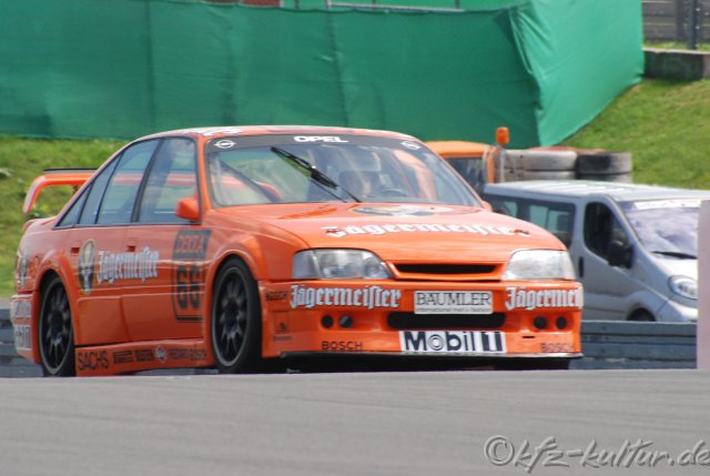 "Das ist wunderbar hier", berichtet Schauspieler Rolf Zacher aus dem Cockpit des orangefarbenen DTM-Opel Omega.  Für ein Wochenende darf der Berliner seine Autoträume ausleben. "Ich liebe Limousinen", sagt Zacher. "Und mit 400 Pferdchen macht der Omega richtig Spaß". Die insgesamt 13 Fahrzeuge umspannen über 100 Jahre Motorsport-Geschichte. Am Steuer eines der ältesten Fahrzeuge der Präsentation sitzt der Vorsitzende der Geschäftsführung von Opel, Hans Demant: "Eine tolle Atmosphäre herrscht hier auf dem Nürburgring". Mit seinen Fahrerkollegen stellt er stolz die Fahrzeuge aus dem Opel-Werksmuseum vor. "Wir wollen alle Autos der Sammlung fahrbereit halten". Manuel Reuter steigt in seinen Opel Calibra, mit dem er vor 11 Jahren die ITC-Weltmeisterschaft gewann, einer der größten Opel-Erfolge. "Toll, dass der Calibra so gut in Schuss ist". Beim Fahren auf der Grand-Prix-Strecke des Nürburgrings werden beim 45-Jährigen Erinnerungen an die DTM der 90er Jahre wach. "Der Calibra ist so leistungsstark, dass er sich vor den modernen Autos nicht zu verstecken bräuchte".Im Fahrerlager ist der zweifache Le-Mans-Sieger vom sehr guten Zustand der Fahrzeuge begeistert.  "Das Fahren mit einem bestimmten Auto interessiert dabei weniger als die Technik und die Erhaltung der alten Rennwagen", sagt Reuter. Christian Geistdörfer fährt mit dem Opel Ascona 400 von 1982 auf die Strecke. An der Seite von Walter Röhrl feierte er mit diesem Fahrzeug die Rallye-Weltmeisterschaft. "Opel war damals den gegenüber den Mitbewerbern logistisch besser und standhafter", erzählt Geistdörfer. Wenn er nicht am Steuer des Weltmeisterautos sitzt oder im Interview am Opel-Zelt im Fahrerlager Rede und Antwort steht, geht er auf die Suche nach Automodellen. "Aber es gibt kaum noch Modelle, die ich nicht habe", so Geistdörfer. Für den stolzen Besitzer eines Ferrari 250 GT Pininfarina von 1959 ist der Besuch beim AvD-Oldtimer-Grand-Prix ein Muß. "Die Präsentation von Opel ist ein willkommener Anlaß zum Besuch in diesem Jahr".