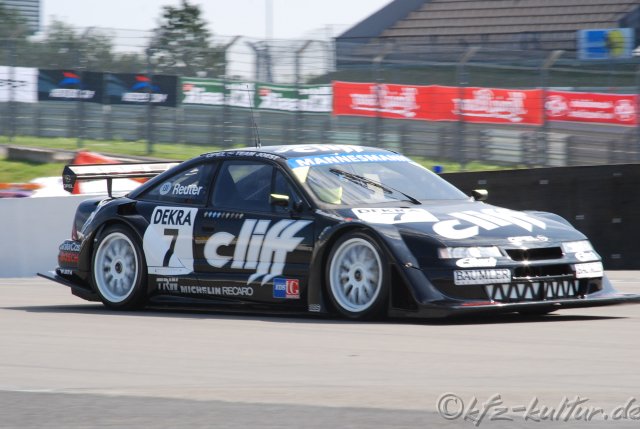 "Das ist wunderbar hier", berichtet Schauspieler Rolf Zacher aus dem Cockpit des orangefarbenen DTM-Opel Omega.  Für ein Wochenende darf der Berliner seine Autoträume ausleben. "Ich liebe Limousinen", sagt Zacher. "Und mit 400 Pferdchen macht der Omega richtig Spaß". Die insgesamt 13 Fahrzeuge umspannen über 100 Jahre Motorsport-Geschichte. Am Steuer eines der ältesten Fahrzeuge der Präsentation sitzt der Vorsitzende der Geschäftsführung von Opel, Hans Demant: "Eine tolle Atmosphäre herrscht hier auf dem Nürburgring". Mit seinen Fahrerkollegen stellt er stolz die Fahrzeuge aus dem Opel-Werksmuseum vor. "Wir wollen alle Autos der Sammlung fahrbereit halten". Manuel Reuter steigt in seinen Opel Calibra, mit dem er vor 11 Jahren die ITC-Weltmeisterschaft gewann, einer der größten Opel-Erfolge. "Toll, dass der Calibra so gut in Schuss ist". Beim Fahren auf der Grand-Prix-Strecke des Nürburgrings werden beim 45-Jährigen Erinnerungen an die DTM der 90er Jahre wach. "Der Calibra ist so leistungsstark, dass er sich vor den modernen Autos nicht zu verstecken bräuchte".Im Fahrerlager ist der zweifache Le-Mans-Sieger vom sehr guten Zustand der Fahrzeuge begeistert.  "Das Fahren mit einem bestimmten Auto interessiert dabei weniger als die Technik und die Erhaltung der alten Rennwagen", sagt Reuter. Christian Geistdörfer fährt mit dem Opel Ascona 400 von 1982 auf die Strecke. An der Seite von Walter Röhrl feierte er mit diesem Fahrzeug die Rallye-Weltmeisterschaft. "Opel war damals den gegenüber den Mitbewerbern logistisch besser und standhafter", erzählt Geistdörfer. Wenn er nicht am Steuer des Weltmeisterautos sitzt oder im Interview am Opel-Zelt im Fahrerlager Rede und Antwort steht, geht er auf die Suche nach Automodellen. "Aber es gibt kaum noch Modelle, die ich nicht habe", so Geistdörfer. Für den stolzen Besitzer eines Ferrari 250 GT Pininfarina von 1959 ist der Besuch beim AvD-Oldtimer-Grand-Prix ein Muß. "Die Präsentation von Opel ist ein willkommener Anlaß zum Besuch in diesem Jahr".
