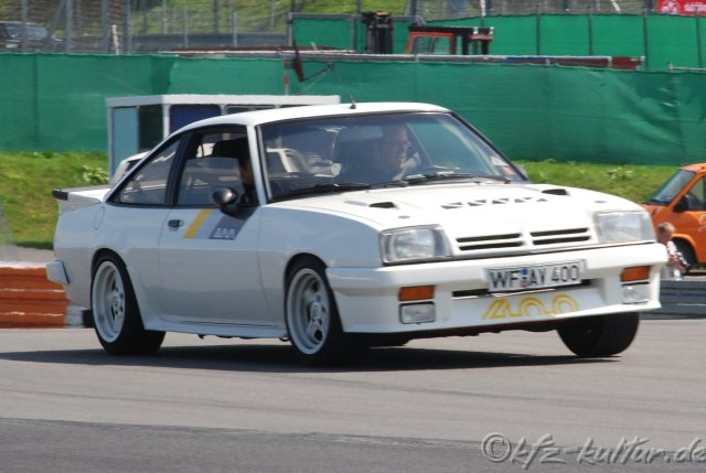 "Das ist wunderbar hier", berichtet Schauspieler Rolf Zacher aus dem Cockpit des orangefarbenen DTM-Opel Omega.  Für ein Wochenende darf der Berliner seine Autoträume ausleben. "Ich liebe Limousinen", sagt Zacher. "Und mit 400 Pferdchen macht der Omega richtig Spaß". Die insgesamt 13 Fahrzeuge umspannen über 100 Jahre Motorsport-Geschichte. Am Steuer eines der ältesten Fahrzeuge der Präsentation sitzt der Vorsitzende der Geschäftsführung von Opel, Hans Demant: "Eine tolle Atmosphäre herrscht hier auf dem Nürburgring". Mit seinen Fahrerkollegen stellt er stolz die Fahrzeuge aus dem Opel-Werksmuseum vor. "Wir wollen alle Autos der Sammlung fahrbereit halten". Manuel Reuter steigt in seinen Opel Calibra, mit dem er vor 11 Jahren die ITC-Weltmeisterschaft gewann, einer der größten Opel-Erfolge. "Toll, dass der Calibra so gut in Schuss ist". Beim Fahren auf der Grand-Prix-Strecke des Nürburgrings werden beim 45-Jährigen Erinnerungen an die DTM der 90er Jahre wach. "Der Calibra ist so leistungsstark, dass er sich vor den modernen Autos nicht zu verstecken bräuchte".Im Fahrerlager ist der zweifache Le-Mans-Sieger vom sehr guten Zustand der Fahrzeuge begeistert.  "Das Fahren mit einem bestimmten Auto interessiert dabei weniger als die Technik und die Erhaltung der alten Rennwagen", sagt Reuter. Christian Geistdörfer fährt mit dem Opel Ascona 400 von 1982 auf die Strecke. An der Seite von Walter Röhrl feierte er mit diesem Fahrzeug die Rallye-Weltmeisterschaft. "Opel war damals den gegenüber den Mitbewerbern logistisch besser und standhafter", erzählt Geistdörfer. Wenn er nicht am Steuer des Weltmeisterautos sitzt oder im Interview am Opel-Zelt im Fahrerlager Rede und Antwort steht, geht er auf die Suche nach Automodellen. "Aber es gibt kaum noch Modelle, die ich nicht habe", so Geistdörfer. Für den stolzen Besitzer eines Ferrari 250 GT Pininfarina von 1959 ist der Besuch beim AvD-Oldtimer-Grand-Prix ein Muß. "Die Präsentation von Opel ist ein willkommener Anlaß zum Besuch in diesem Jahr".