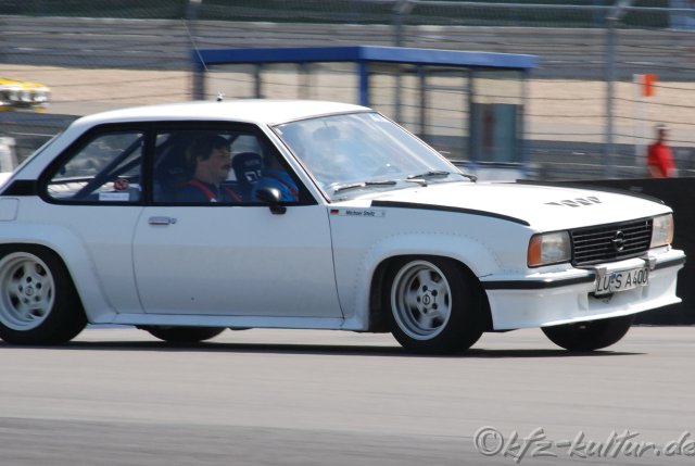 "Das ist wunderbar hier", berichtet Schauspieler Rolf Zacher aus dem Cockpit des orangefarbenen DTM-Opel Omega.  Für ein Wochenende darf der Berliner seine Autoträume ausleben. "Ich liebe Limousinen", sagt Zacher. "Und mit 400 Pferdchen macht der Omega richtig Spaß". Die insgesamt 13 Fahrzeuge umspannen über 100 Jahre Motorsport-Geschichte. Am Steuer eines der ältesten Fahrzeuge der Präsentation sitzt der Vorsitzende der Geschäftsführung von Opel, Hans Demant: "Eine tolle Atmosphäre herrscht hier auf dem Nürburgring". Mit seinen Fahrerkollegen stellt er stolz die Fahrzeuge aus dem Opel-Werksmuseum vor. "Wir wollen alle Autos der Sammlung fahrbereit halten". Manuel Reuter steigt in seinen Opel Calibra, mit dem er vor 11 Jahren die ITC-Weltmeisterschaft gewann, einer der größten Opel-Erfolge. "Toll, dass der Calibra so gut in Schuss ist". Beim Fahren auf der Grand-Prix-Strecke des Nürburgrings werden beim 45-Jährigen Erinnerungen an die DTM der 90er Jahre wach. "Der Calibra ist so leistungsstark, dass er sich vor den modernen Autos nicht zu verstecken bräuchte".Im Fahrerlager ist der zweifache Le-Mans-Sieger vom sehr guten Zustand der Fahrzeuge begeistert.  "Das Fahren mit einem bestimmten Auto interessiert dabei weniger als die Technik und die Erhaltung der alten Rennwagen", sagt Reuter. Christian Geistdörfer fährt mit dem Opel Ascona 400 von 1982 auf die Strecke. An der Seite von Walter Röhrl feierte er mit diesem Fahrzeug die Rallye-Weltmeisterschaft. "Opel war damals den gegenüber den Mitbewerbern logistisch besser und standhafter", erzählt Geistdörfer. Wenn er nicht am Steuer des Weltmeisterautos sitzt oder im Interview am Opel-Zelt im Fahrerlager Rede und Antwort steht, geht er auf die Suche nach Automodellen. "Aber es gibt kaum noch Modelle, die ich nicht habe", so Geistdörfer. Für den stolzen Besitzer eines Ferrari 250 GT Pininfarina von 1959 ist der Besuch beim AvD-Oldtimer-Grand-Prix ein Muß. "Die Präsentation von Opel ist ein willkommener Anlaß zum Besuch in diesem Jahr".