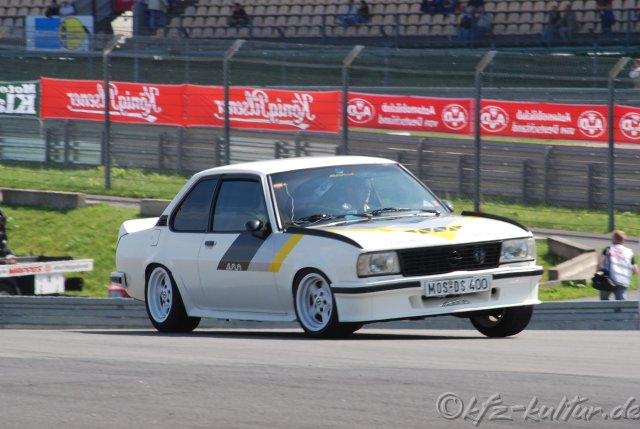 "Das ist wunderbar hier", berichtet Schauspieler Rolf Zacher aus dem Cockpit des orangefarbenen DTM-Opel Omega.  Für ein Wochenende darf der Berliner seine Autoträume ausleben. "Ich liebe Limousinen", sagt Zacher. "Und mit 400 Pferdchen macht der Omega richtig Spaß". Die insgesamt 13 Fahrzeuge umspannen über 100 Jahre Motorsport-Geschichte. Am Steuer eines der ältesten Fahrzeuge der Präsentation sitzt der Vorsitzende der Geschäftsführung von Opel, Hans Demant: "Eine tolle Atmosphäre herrscht hier auf dem Nürburgring". Mit seinen Fahrerkollegen stellt er stolz die Fahrzeuge aus dem Opel-Werksmuseum vor. "Wir wollen alle Autos der Sammlung fahrbereit halten". Manuel Reuter steigt in seinen Opel Calibra, mit dem er vor 11 Jahren die ITC-Weltmeisterschaft gewann, einer der größten Opel-Erfolge. "Toll, dass der Calibra so gut in Schuss ist". Beim Fahren auf der Grand-Prix-Strecke des Nürburgrings werden beim 45-Jährigen Erinnerungen an die DTM der 90er Jahre wach. "Der Calibra ist so leistungsstark, dass er sich vor den modernen Autos nicht zu verstecken bräuchte".Im Fahrerlager ist der zweifache Le-Mans-Sieger vom sehr guten Zustand der Fahrzeuge begeistert.  "Das Fahren mit einem bestimmten Auto interessiert dabei weniger als die Technik und die Erhaltung der alten Rennwagen", sagt Reuter. Christian Geistdörfer fährt mit dem Opel Ascona 400 von 1982 auf die Strecke. An der Seite von Walter Röhrl feierte er mit diesem Fahrzeug die Rallye-Weltmeisterschaft. "Opel war damals den gegenüber den Mitbewerbern logistisch besser und standhafter", erzählt Geistdörfer. Wenn er nicht am Steuer des Weltmeisterautos sitzt oder im Interview am Opel-Zelt im Fahrerlager Rede und Antwort steht, geht er auf die Suche nach Automodellen. "Aber es gibt kaum noch Modelle, die ich nicht habe", so Geistdörfer. Für den stolzen Besitzer eines Ferrari 250 GT Pininfarina von 1959 ist der Besuch beim AvD-Oldtimer-Grand-Prix ein Muß. "Die Präsentation von Opel ist ein willkommener Anlaß zum Besuch in diesem Jahr".