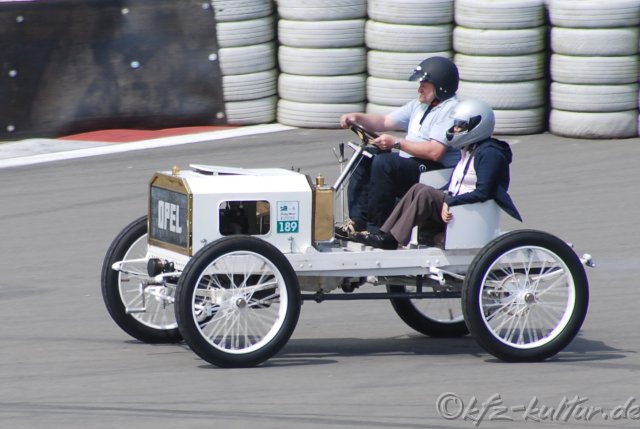 "Das ist wunderbar hier", berichtet Schauspieler Rolf Zacher aus dem Cockpit des orangefarbenen DTM-Opel Omega.  Für ein Wochenende darf der Berliner seine Autoträume ausleben. "Ich liebe Limousinen", sagt Zacher. "Und mit 400 Pferdchen macht der Omega richtig Spaß". Die insgesamt 13 Fahrzeuge umspannen über 100 Jahre Motorsport-Geschichte. Am Steuer eines der ältesten Fahrzeuge der Präsentation sitzt der Vorsitzende der Geschäftsführung von Opel, Hans Demant: "Eine tolle Atmosphäre herrscht hier auf dem Nürburgring". Mit seinen Fahrerkollegen stellt er stolz die Fahrzeuge aus dem Opel-Werksmuseum vor. "Wir wollen alle Autos der Sammlung fahrbereit halten". Manuel Reuter steigt in seinen Opel Calibra, mit dem er vor 11 Jahren die ITC-Weltmeisterschaft gewann, einer der größten Opel-Erfolge. "Toll, dass der Calibra so gut in Schuss ist". Beim Fahren auf der Grand-Prix-Strecke des Nürburgrings werden beim 45-Jährigen Erinnerungen an die DTM der 90er Jahre wach. "Der Calibra ist so leistungsstark, dass er sich vor den modernen Autos nicht zu verstecken bräuchte".Im Fahrerlager ist der zweifache Le-Mans-Sieger vom sehr guten Zustand der Fahrzeuge begeistert.  "Das Fahren mit einem bestimmten Auto interessiert dabei weniger als die Technik und die Erhaltung der alten Rennwagen", sagt Reuter. Christian Geistdörfer fährt mit dem Opel Ascona 400 von 1982 auf die Strecke. An der Seite von Walter Röhrl feierte er mit diesem Fahrzeug die Rallye-Weltmeisterschaft. "Opel war damals den gegenüber den Mitbewerbern logistisch besser und standhafter", erzählt Geistdörfer. Wenn er nicht am Steuer des Weltmeisterautos sitzt oder im Interview am Opel-Zelt im Fahrerlager Rede und Antwort steht, geht er auf die Suche nach Automodellen. "Aber es gibt kaum noch Modelle, die ich nicht habe", so Geistdörfer. Für den stolzen Besitzer eines Ferrari 250 GT Pininfarina von 1959 ist der Besuch beim AvD-Oldtimer-Grand-Prix ein Muß. "Die Präsentation von Opel ist ein willkommener Anlaß zum Besuch in diesem Jahr".