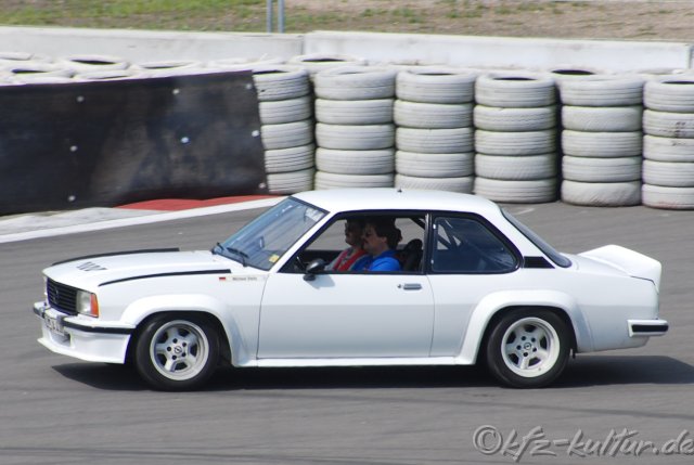 "Das ist wunderbar hier", berichtet Schauspieler Rolf Zacher aus dem Cockpit des orangefarbenen DTM-Opel Omega.  Für ein Wochenende darf der Berliner seine Autoträume ausleben. "Ich liebe Limousinen", sagt Zacher. "Und mit 400 Pferdchen macht der Omega richtig Spaß". Die insgesamt 13 Fahrzeuge umspannen über 100 Jahre Motorsport-Geschichte. Am Steuer eines der ältesten Fahrzeuge der Präsentation sitzt der Vorsitzende der Geschäftsführung von Opel, Hans Demant: "Eine tolle Atmosphäre herrscht hier auf dem Nürburgring". Mit seinen Fahrerkollegen stellt er stolz die Fahrzeuge aus dem Opel-Werksmuseum vor. "Wir wollen alle Autos der Sammlung fahrbereit halten". Manuel Reuter steigt in seinen Opel Calibra, mit dem er vor 11 Jahren die ITC-Weltmeisterschaft gewann, einer der größten Opel-Erfolge. "Toll, dass der Calibra so gut in Schuss ist". Beim Fahren auf der Grand-Prix-Strecke des Nürburgrings werden beim 45-Jährigen Erinnerungen an die DTM der 90er Jahre wach. "Der Calibra ist so leistungsstark, dass er sich vor den modernen Autos nicht zu verstecken bräuchte".Im Fahrerlager ist der zweifache Le-Mans-Sieger vom sehr guten Zustand der Fahrzeuge begeistert.  "Das Fahren mit einem bestimmten Auto interessiert dabei weniger als die Technik und die Erhaltung der alten Rennwagen", sagt Reuter. Christian Geistdörfer fährt mit dem Opel Ascona 400 von 1982 auf die Strecke. An der Seite von Walter Röhrl feierte er mit diesem Fahrzeug die Rallye-Weltmeisterschaft. "Opel war damals den gegenüber den Mitbewerbern logistisch besser und standhafter", erzählt Geistdörfer. Wenn er nicht am Steuer des Weltmeisterautos sitzt oder im Interview am Opel-Zelt im Fahrerlager Rede und Antwort steht, geht er auf die Suche nach Automodellen. "Aber es gibt kaum noch Modelle, die ich nicht habe", so Geistdörfer. Für den stolzen Besitzer eines Ferrari 250 GT Pininfarina von 1959 ist der Besuch beim AvD-Oldtimer-Grand-Prix ein Muß. "Die Präsentation von Opel ist ein willkommener Anlaß zum Besuch in diesem Jahr".