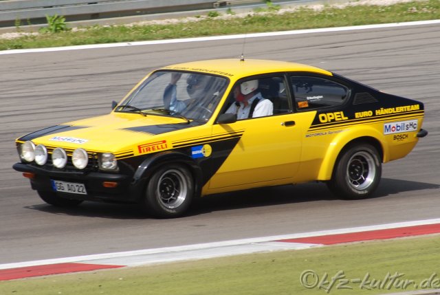 "Das ist wunderbar hier", berichtet Schauspieler Rolf Zacher aus dem Cockpit des orangefarbenen DTM-Opel Omega.  Für ein Wochenende darf der Berliner seine Autoträume ausleben. "Ich liebe Limousinen", sagt Zacher. "Und mit 400 Pferdchen macht der Omega richtig Spaß". Die insgesamt 13 Fahrzeuge umspannen über 100 Jahre Motorsport-Geschichte. Am Steuer eines der ältesten Fahrzeuge der Präsentation sitzt der Vorsitzende der Geschäftsführung von Opel, Hans Demant: "Eine tolle Atmosphäre herrscht hier auf dem Nürburgring". Mit seinen Fahrerkollegen stellt er stolz die Fahrzeuge aus dem Opel-Werksmuseum vor. "Wir wollen alle Autos der Sammlung fahrbereit halten". Manuel Reuter steigt in seinen Opel Calibra, mit dem er vor 11 Jahren die ITC-Weltmeisterschaft gewann, einer der größten Opel-Erfolge. "Toll, dass der Calibra so gut in Schuss ist". Beim Fahren auf der Grand-Prix-Strecke des Nürburgrings werden beim 45-Jährigen Erinnerungen an die DTM der 90er Jahre wach. "Der Calibra ist so leistungsstark, dass er sich vor den modernen Autos nicht zu verstecken bräuchte".Im Fahrerlager ist der zweifache Le-Mans-Sieger vom sehr guten Zustand der Fahrzeuge begeistert.  "Das Fahren mit einem bestimmten Auto interessiert dabei weniger als die Technik und die Erhaltung der alten Rennwagen", sagt Reuter. Christian Geistdörfer fährt mit dem Opel Ascona 400 von 1982 auf die Strecke. An der Seite von Walter Röhrl feierte er mit diesem Fahrzeug die Rallye-Weltmeisterschaft. "Opel war damals den gegenüber den Mitbewerbern logistisch besser und standhafter", erzählt Geistdörfer. Wenn er nicht am Steuer des Weltmeisterautos sitzt oder im Interview am Opel-Zelt im Fahrerlager Rede und Antwort steht, geht er auf die Suche nach Automodellen. "Aber es gibt kaum noch Modelle, die ich nicht habe", so Geistdörfer. Für den stolzen Besitzer eines Ferrari 250 GT Pininfarina von 1959 ist der Besuch beim AvD-Oldtimer-Grand-Prix ein Muß. "Die Präsentation von Opel ist ein willkommener Anlaß zum Besuch in diesem Jahr".