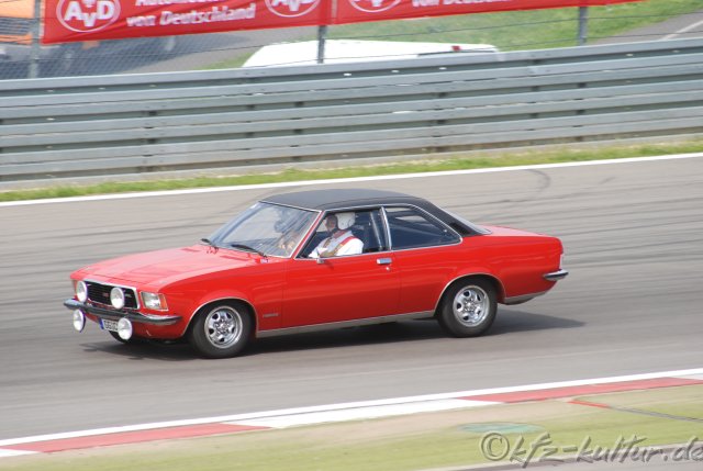 "Das ist wunderbar hier", berichtet Schauspieler Rolf Zacher aus dem Cockpit des orangefarbenen DTM-Opel Omega.  Für ein Wochenende darf der Berliner seine Autoträume ausleben. "Ich liebe Limousinen", sagt Zacher. "Und mit 400 Pferdchen macht der Omega richtig Spaß". Die insgesamt 13 Fahrzeuge umspannen über 100 Jahre Motorsport-Geschichte. Am Steuer eines der ältesten Fahrzeuge der Präsentation sitzt der Vorsitzende der Geschäftsführung von Opel, Hans Demant: "Eine tolle Atmosphäre herrscht hier auf dem Nürburgring". Mit seinen Fahrerkollegen stellt er stolz die Fahrzeuge aus dem Opel-Werksmuseum vor. "Wir wollen alle Autos der Sammlung fahrbereit halten". Manuel Reuter steigt in seinen Opel Calibra, mit dem er vor 11 Jahren die ITC-Weltmeisterschaft gewann, einer der größten Opel-Erfolge. "Toll, dass der Calibra so gut in Schuss ist". Beim Fahren auf der Grand-Prix-Strecke des Nürburgrings werden beim 45-Jährigen Erinnerungen an die DTM der 90er Jahre wach. "Der Calibra ist so leistungsstark, dass er sich vor den modernen Autos nicht zu verstecken bräuchte".Im Fahrerlager ist der zweifache Le-Mans-Sieger vom sehr guten Zustand der Fahrzeuge begeistert.  "Das Fahren mit einem bestimmten Auto interessiert dabei weniger als die Technik und die Erhaltung der alten Rennwagen", sagt Reuter. Christian Geistdörfer fährt mit dem Opel Ascona 400 von 1982 auf die Strecke. An der Seite von Walter Röhrl feierte er mit diesem Fahrzeug die Rallye-Weltmeisterschaft. "Opel war damals den gegenüber den Mitbewerbern logistisch besser und standhafter", erzählt Geistdörfer. Wenn er nicht am Steuer des Weltmeisterautos sitzt oder im Interview am Opel-Zelt im Fahrerlager Rede und Antwort steht, geht er auf die Suche nach Automodellen. "Aber es gibt kaum noch Modelle, die ich nicht habe", so Geistdörfer. Für den stolzen Besitzer eines Ferrari 250 GT Pininfarina von 1959 ist der Besuch beim AvD-Oldtimer-Grand-Prix ein Muß. "Die Präsentation von Opel ist ein willkommener Anlaß zum Besuch in diesem Jahr".