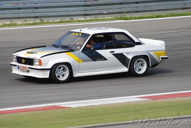"Das ist wunderbar hier", berichtet Schauspieler Rolf Zacher aus dem Cockpit des orangefarbenen DTM-Opel Omega.  Für ein Wochenende darf der Berliner seine Autoträume ausleben. "Ich liebe Limousinen", sagt Zacher. "Und mit 400 Pferdchen macht der Omega richtig Spaß". Die insgesamt 13 Fahrzeuge umspannen über 100 Jahre Motorsport-Geschichte. Am Steuer eines der ältesten Fahrzeuge der Präsentation sitzt der Vorsitzende der Geschäftsführung von Opel, Hans Demant: "Eine tolle Atmosphäre herrscht hier auf dem Nürburgring". Mit seinen Fahrerkollegen stellt er stolz die Fahrzeuge aus dem Opel-Werksmuseum vor. "Wir wollen alle Autos der Sammlung fahrbereit halten". Manuel Reuter steigt in seinen Opel Calibra, mit dem er vor 11 Jahren die ITC-Weltmeisterschaft gewann, einer der größten Opel-Erfolge. "Toll, dass der Calibra so gut in Schuss ist". Beim Fahren auf der Grand-Prix-Strecke des Nürburgrings werden beim 45-Jährigen Erinnerungen an die DTM der 90er Jahre wach. "Der Calibra ist so leistungsstark, dass er sich vor den modernen Autos nicht zu verstecken bräuchte".Im Fahrerlager ist der zweifache Le-Mans-Sieger vom sehr guten Zustand der Fahrzeuge begeistert.  "Das Fahren mit einem bestimmten Auto interessiert dabei weniger als die Technik und die Erhaltung der alten Rennwagen", sagt Reuter. Christian Geistdörfer fährt mit dem Opel Ascona 400 von 1982 auf die Strecke. An der Seite von Walter Röhrl feierte er mit diesem Fahrzeug die Rallye-Weltmeisterschaft. "Opel war damals den gegenüber den Mitbewerbern logistisch besser und standhafter", erzählt Geistdörfer. Wenn er nicht am Steuer des Weltmeisterautos sitzt oder im Interview am Opel-Zelt im Fahrerlager Rede und Antwort steht, geht er auf die Suche nach Automodellen. "Aber es gibt kaum noch Modelle, die ich nicht habe", so Geistdörfer. Für den stolzen Besitzer eines Ferrari 250 GT Pininfarina von 1959 ist der Besuch beim AvD-Oldtimer-Grand-Prix ein Muß. "Die Präsentation von Opel ist ein willkommener Anlaß zum Besuch in diesem Jahr".