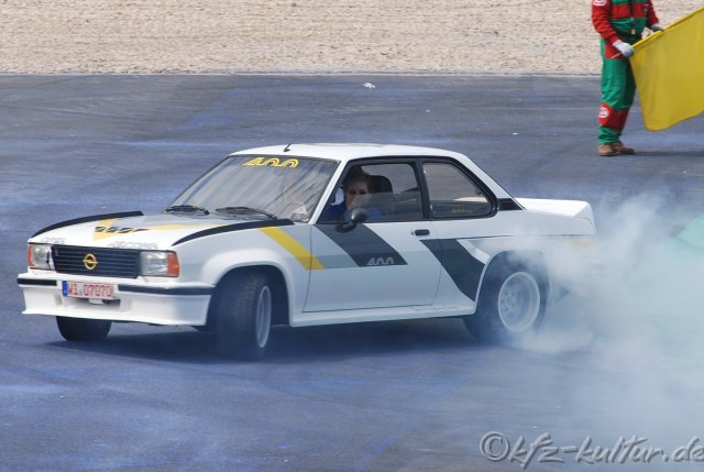 "Das ist wunderbar hier", berichtet Schauspieler Rolf Zacher aus dem Cockpit des orangefarbenen DTM-Opel Omega.  Für ein Wochenende darf der Berliner seine Autoträume ausleben. "Ich liebe Limousinen", sagt Zacher. "Und mit 400 Pferdchen macht der Omega richtig Spaß". Die insgesamt 13 Fahrzeuge umspannen über 100 Jahre Motorsport-Geschichte. Am Steuer eines der ältesten Fahrzeuge der Präsentation sitzt der Vorsitzende der Geschäftsführung von Opel, Hans Demant: "Eine tolle Atmosphäre herrscht hier auf dem Nürburgring". Mit seinen Fahrerkollegen stellt er stolz die Fahrzeuge aus dem Opel-Werksmuseum vor. "Wir wollen alle Autos der Sammlung fahrbereit halten". Manuel Reuter steigt in seinen Opel Calibra, mit dem er vor 11 Jahren die ITC-Weltmeisterschaft gewann, einer der größten Opel-Erfolge. "Toll, dass der Calibra so gut in Schuss ist". Beim Fahren auf der Grand-Prix-Strecke des Nürburgrings werden beim 45-Jährigen Erinnerungen an die DTM der 90er Jahre wach. "Der Calibra ist so leistungsstark, dass er sich vor den modernen Autos nicht zu verstecken bräuchte".Im Fahrerlager ist der zweifache Le-Mans-Sieger vom sehr guten Zustand der Fahrzeuge begeistert.  "Das Fahren mit einem bestimmten Auto interessiert dabei weniger als die Technik und die Erhaltung der alten Rennwagen", sagt Reuter. Christian Geistdörfer fährt mit dem Opel Ascona 400 von 1982 auf die Strecke. An der Seite von Walter Röhrl feierte er mit diesem Fahrzeug die Rallye-Weltmeisterschaft. "Opel war damals den gegenüber den Mitbewerbern logistisch besser und standhafter", erzählt Geistdörfer. Wenn er nicht am Steuer des Weltmeisterautos sitzt oder im Interview am Opel-Zelt im Fahrerlager Rede und Antwort steht, geht er auf die Suche nach Automodellen. "Aber es gibt kaum noch Modelle, die ich nicht habe", so Geistdörfer. Für den stolzen Besitzer eines Ferrari 250 GT Pininfarina von 1959 ist der Besuch beim AvD-Oldtimer-Grand-Prix ein Muß. "Die Präsentation von Opel ist ein willkommener Anlaß zum Besuch in diesem Jahr".