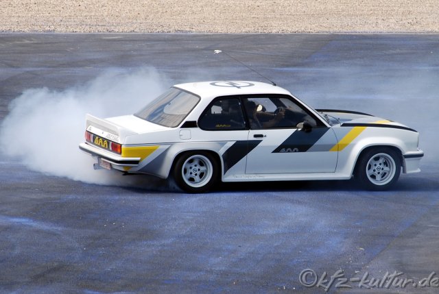 "Das ist wunderbar hier", berichtet Schauspieler Rolf Zacher aus dem Cockpit des orangefarbenen DTM-Opel Omega.  Für ein Wochenende darf der Berliner seine Autoträume ausleben. "Ich liebe Limousinen", sagt Zacher. "Und mit 400 Pferdchen macht der Omega richtig Spaß". Die insgesamt 13 Fahrzeuge umspannen über 100 Jahre Motorsport-Geschichte. Am Steuer eines der ältesten Fahrzeuge der Präsentation sitzt der Vorsitzende der Geschäftsführung von Opel, Hans Demant: "Eine tolle Atmosphäre herrscht hier auf dem Nürburgring". Mit seinen Fahrerkollegen stellt er stolz die Fahrzeuge aus dem Opel-Werksmuseum vor. "Wir wollen alle Autos der Sammlung fahrbereit halten". Manuel Reuter steigt in seinen Opel Calibra, mit dem er vor 11 Jahren die ITC-Weltmeisterschaft gewann, einer der größten Opel-Erfolge. "Toll, dass der Calibra so gut in Schuss ist". Beim Fahren auf der Grand-Prix-Strecke des Nürburgrings werden beim 45-Jährigen Erinnerungen an die DTM der 90er Jahre wach. "Der Calibra ist so leistungsstark, dass er sich vor den modernen Autos nicht zu verstecken bräuchte".Im Fahrerlager ist der zweifache Le-Mans-Sieger vom sehr guten Zustand der Fahrzeuge begeistert.  "Das Fahren mit einem bestimmten Auto interessiert dabei weniger als die Technik und die Erhaltung der alten Rennwagen", sagt Reuter. Christian Geistdörfer fährt mit dem Opel Ascona 400 von 1982 auf die Strecke. An der Seite von Walter Röhrl feierte er mit diesem Fahrzeug die Rallye-Weltmeisterschaft. "Opel war damals den gegenüber den Mitbewerbern logistisch besser und standhafter", erzählt Geistdörfer. Wenn er nicht am Steuer des Weltmeisterautos sitzt oder im Interview am Opel-Zelt im Fahrerlager Rede und Antwort steht, geht er auf die Suche nach Automodellen. "Aber es gibt kaum noch Modelle, die ich nicht habe", so Geistdörfer. Für den stolzen Besitzer eines Ferrari 250 GT Pininfarina von 1959 ist der Besuch beim AvD-Oldtimer-Grand-Prix ein Muß. "Die Präsentation von Opel ist ein willkommener Anlaß zum Besuch in diesem Jahr".