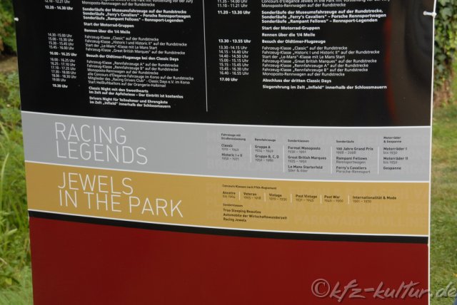 Highlights 2008 waren die Besuche der bekannten Rennfahrer Jochen Mass, Hans Herrmann, Bernd Schneider, Hans Joachim Stuck bei den Classic Days. Schloss Dyck Mit Mercedes Benz feiern die Classic Days am Schloss Dyck im Jahr 2008 das Jubiläum zum Thema „100 Jahre Grand Prix-Erfolge“. Insgesamt vier Formel 1 Boliden sind am Schloss zu sehen, aber auch der Benz 1908 mit dem Christian Lautenschlager 1908 den Grand Prix von Dieppe (F) gewann. Hans Herrmann fährt seinen „Dienstwagen“ – einen Silberpfeil W 196 aus dem Jahr 1955. Jochen Mass fährt den grossen Benz 1908 mit fast 14 Litern Hubraum, Bernd Schneider wird im Formel 1 von 1998, dem Weltmeisterfahrzeug MP4-13 von Mika Häkkinen, seine Kreise um das Schloss ziehen und Dieter Glemser fährt das AMG-F1-Safety-Car um die Rundstrecke vor den Ausfahrten den Rennfahrzeuge zu sichern. Toyota zeigt Rallye-Fahrzeuge (WRC) in einem Sonderlauf mit Isolde Holderied am Steuer. Und auch Jochen Berger ist – wie schon 2007 – wieder am Start. Die Autostadt aus Wolfsburg sendet aus dem Zeithaus sympathische Vertreter der „Volkswagen“ – aber auch das Pacecar für die Tangenten vom Schloss bis zum Startbereich – ein Polizei-VW –Special-Käfer Baujahr 1953. Schloss Dyck Porsche der Modelle 904, 907, 910 und auch sogar ein spektakulärer Porsche 956 (Ex- Fahrzeug von Ayrton Senna) begehen das Jubiläum „60 Jahre Porsche“ bei den Classic Days. Bei den Formel Monoposto aus den 50er und 60er Jahren startet Hans Jörg Goetzl von der Motor Klassik im Lotus 16 aus dem Besitz von Graham Hill. Mit Ihm sind über 15 weitere Monoposto am Start und das Feld wird noch ergänzt durch zusätzliche 20 Starter der HRA ( Graf Berghe von Trips Pokal des ADAC) , die an 80 Jahre Wolfgang Graf Berghe von Trips erinnern wollen. Eine Vielzahl von Fahrzeugen in dieser Kombination und Anzahl findet man sonst in vergleichbaren Veranstaltungen sicherlich nicht. Mehr Informationen finden Sie hier… Zusätzlich zu den Sonderläufen der Werksmuseen und Rennfahrer-Vereinigungen bringen wieder eine Vielzahl von Privat-Besitzern wunderschöne und seltene Fahrzeuge zum Schloss. Einige Highlights aus der Liste der startenden Fahrzeuge finden Sie hier… Ergänzt werden die Starts der Startergruppen im Bereich „Racing Legends“ durch eindrucksvolle Demonstrationsfahrten von Rennfahrzeugen aus Privatsammlungen und Werksmuseen.Seltene Fahrzeuge und solche, die nur äußerst selten auf der Rennstrecke in Bewegung zu sehen sind, geben sich ein Stelldichein und begeistern die Zuschauer. Es gibt ein „Neues Fahrerlager“, in dem Formelfahrzeuge, Rennsportwagen und Rennmotorräder zu sehen sein werden. Das Schloss selbst – mit seinen wundervollen Innenhöfen – wird zum „Alten Fahrerlager“ , in dem hauptsächliche die Vorkriegsfahrzeuge mit ihrer diffizilen Technik und spannender Rennhistorie untergebracht sein werden. Die Innenhöfe des Schlosses sind aus Gründen der Zuschauersicherheit während der Ein- und Ausfahrten der historischen Rennfahrzeuge für Fussgänger und Besucher nicht zugänglich, öffnen aber nach dem Rennbetrieb am späten Nachmittag und laden zum „Pitwalk“ ein. Für den Besuch der Innenhöfe während der Rennrunden steht ein zahlenmäßig begrenztes Kartenkontingent zur Verfügung. Das „Neue Fahrerlager“ bleibt im Jahr 2008 durchgängig geöffnet – die Fahrstrassen sind hier abgetrennt. Der Concours d´Elegance am Schloss Dyck zeigt den interessierten Besuchern und Sammlern „Jewels in the Park“. Graf-Berghe-von-Trips-Trophäe Im Schlosspark wollen die Classic Days eine stilvolle Inszenierung der Ausstellungsfahrzeuge im Concours d´Elegance mit englischem Flair bieten. Über 80 Schmuckstücke aus der Automobil- und Karosserie-Baukunst sind hier versammelt und legen eindrucksvoll Zeugnis von prachtvollen Zeiten und großem handwerklichen Geschick ab. Der Schloss Dyck Classic Days Ticket-Shop ist nun geschlossen. Wir empfehlen die Bestellung über: www.ticketonline.com Sie können die Eintrittskarten zu den Classic Days 2008 auch in Vorverkaufs-Stellen im Großraum Neuss / Jüchen erwerben. Die Adressen finden Sie hier. Die Classic Days 2008 – ein Oldtimerfest für’s Herz und für die Sinne Picknicken rund ums Schloss ist ausdrücklich erwünscht, Musikprogramm sorgt auf den Wiesen vor der Torburg für Unterhaltung. Im Concours d´Elegance ist Flanieren angesagt. Alle Besucher sind einladen in zeitgenössischer Kleidung und mit dem eigenen Klassiker zum Schloss zu kommen. Das Miscanthus-Schilfgrasfeld in Schlossnähe steht in diesem Jahr komplett für die Besucher-Klassiker zur Verfügung. Der Samstagabend bei den Classic Days 2008 - ein bunter „50er Jahre - Abend“! Erstmals gibt es am Samstagabend – gleich nach dem Rennprogramm der Classic Days – ein buntes Abendprogramm im Classic Days-Zelt auf der Apfelwiese vor dem Schloss. Der Eintritt ist kostenlos. Planen Sie einen Abend mit Freunden nach einem ereignisreichen Tag und bleiben Sie einfach ein paar Stunden länger am Schloss. Im dekorierten Classic Days Zelt laden „Die Sweethearts“ zu einer abwechslungsreichen Wirtschaftswunder-Revue und einer Zeit-Reise in die 50er Jahre ein. Schlager, Sketche und Pointen – von Caterina Valente bis Heinz Erhardt. Anette Praktisch, Klaus Saubermann und Wolfgang Wunder lassen als Trio die schönsten deutschen Schlagerperlen der Wirtschaftswunderzeit wieder lebendig werden. In ihrer mitreißenden Show besingen sie virtuos das optimistische Lebensgefühl der 50er Jahre. Mit witzigen Werbespots und Sketchen und Pointen a la Heinz Erhardt.. Souvenirs Souvenirs, Zwei kleine Italiener, Ich will keine Schokolade, Ohne Krimi geht die Mimi… Schuld war nur der Bossanova, Quando Quando, Caprifischer, Es liegt was in der Luft… Heinz Erhardt, Peter Frankenfeld, Conny Froboess, Heid Brühl, Peter Kraus, Bibi Jones, Ilse Werner, Bill Ramsey, Trude Herr….und viele mehr. Also vormerken: Samstagabend bei den Classic Days – am Sc