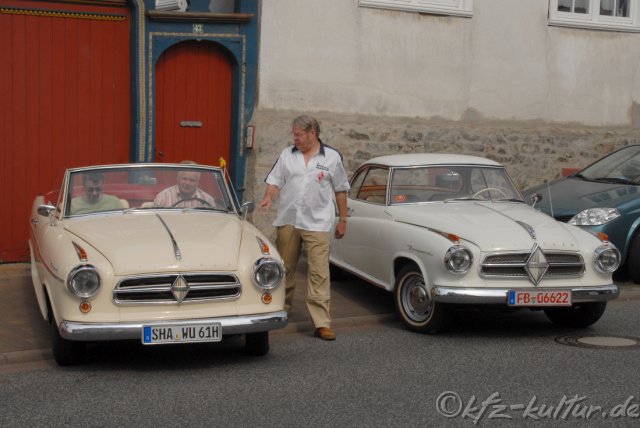 Der Veranstalter Golden Oldies ist stolz von abermals 70000 Zuschauer an 3 Tagen. Hier bei KFZ-Kultur.de sehen Sie 600 Bilder Fotos vom Samstag, den 26.7.2008 Vom 25. bis 27. Juli 2008 in Wettenberg 19. Festival Golden Oldies- Eine hessische Gemeinde auf Zeitreise in die Wirtschaftswunderzeit der 50er und 60er 3 Tage - 9 Bühnen - 50 Livebands - über 1.000 Oldtimer und 70.000 Besucher Musik & Motoren beim Festival Golden Oldies im Schatten der Burg Gleiberg Das mittelhessische Wettenberg wird zum 19. Mail für drei Tage „Deutschlands Hauptstadt der Oldiemusik“. Auf 9 Bühnen präsentieren rund 50 Musikgruppen Schlager, Beat, Soul, und Rock’n’Roll im Schatten der Burg Gleiberg. Eine atemberaubende Zeitreise in die 50er, 60er und 70er Jahre mit Deutschlands größter Oldtimer-Show. Das Motto in diesem Jahr: „Familie, Fortschritt & Souvenirs“ Das Festival hat Kultstatus und gehört zu den TOP Oldtimer Veranstaltungen in der Bundesrepublik. Was vor 18 Jahren mit nur 8 Bands, vier Bühnen und rund 3.000 begeisterten Fans begann, wurde inzwischen von der Fachpresse zu „Deutschlands schönster Oldiefete“ nominiert. Knapp 70.000 Besucher zählte das Festival im vergangenen Jahr. Mit Bus, Bahn und eigenem PKW reisen sie aus der gesamten Bundesrepublik und auch aus dem benachbarten Ausland an, um bei diesem Ereignis dabei zu sein. Golden Oldies bietet gleichermaßen Information und Unterhaltung zur Kulturgeschichte der vergangenen 50 Jahre. Von überregionalem Interesse ist bei Autoliebhabern die Ausstellung der rund 1.000 Klassikfahrzeuge am Sonntag, 27. Juli 2008 zu der private Fahrzeugbesitzer und über 50 Oldtimerclubs eingeladen sind.. Fahrzeuge, die zum Motto „Familie, Fortschritt Souvenirs“ passen, sind in diesem Jahr besonders gern gesehen, denn ihnen wird dieses Mal besondere Aufmerksamkeit gewidmet. Wiedersehen mit meinem ersten Auto: HEINRICH PUMPERNICKEL, alias Chris Howland. Er wird zum 19. Festival nach Wettenberg kommen, um ein Wiedersehen mit seinem 1. Auto zu feiern: Einem DKW 3=6, 2 türig fuhr "Mr. Pumpernickel" in den 50er Jahren Das Programm wird abgerundet durch zahlreiche Aktionen, Ausstellungen, ein umfangreiches Kinderprogramm und durch Deutschlands größten „Nostalgie Markt der 50er Jahre“. In rund 100 Verkaufsständen wird Originalware der sogenannten „Wirtschaftswunderzeit“ angeboten. Petticoats, Tulpenlampen, Schallplatten und Jukeboxen stehen in der Hauptstraße und in der Mehrzweckhalle zum Verkauf. Das Rockmuseum von Maria und Wolfgang Thomas stellt in der Mehrzweckhalle einen Querschnitt aus der Gesamtsammlung aus. Cruising der besonderen Art: Kinderwagen-Parade! Auf vier Rädern, 1 Fahrer(in) und meist nur mit einem Mitfahrer "belegt"... Am Samstag, dem 26. Juli 2008 gibt es ein Cruising der besonderen Art: Der Kostümverleih "Wundertüte" lädt ein, sich im Outfit der 50er/60er und mit einem Kinderwagen dieser Epoche zum Festivals Golden Oldies zu präsentieren und der „Deutsche Petticoat-Wettbewerb“ lädt alle Besucher des Festivals zu einer Zusammenkunft im Outfit der 50er bis 70er Jahre ein. Zusammengestellt wird das Festival von der Peter Turczak eventeam GmbH & Co KG. Unterstützt wird das Festival Golden Oldies von der Bitburger Brauerei, Neils & Kraft Mercedes Partner der Daimler-Chrysler AG, der Deutschen Bahn AG und der SFinanzgruppe Hessen-Thüringen. Nähere Informationen unter www.Golden-Oldies.de oder direkt bei der Gemeinde Wettenberg, 35435 Wettenberg, Telefon: 06 4 1 – 8 04 62