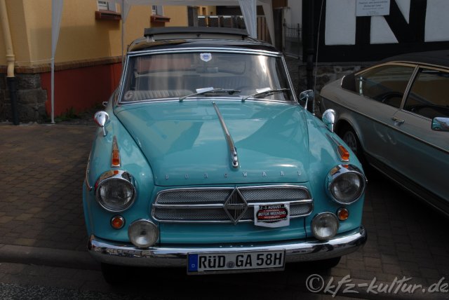 Der Veranstalter Golden Oldies ist stolz von abermals 70000 Zuschauer an 3 Tagen. Hier bei KFZ-Kultur.de sehen Sie 600 Bilder Fotos vom Samstag, den 26.7.2008 Vom 25. bis 27. Juli 2008 in Wettenberg 19. Festival Golden Oldies- Eine hessische Gemeinde auf Zeitreise in die Wirtschaftswunderzeit der 50er und 60er 3 Tage - 9 Bühnen - 50 Livebands - über 1.000 Oldtimer und 70.000 Besucher Musik & Motoren beim Festival Golden Oldies im Schatten der Burg Gleiberg Das mittelhessische Wettenberg wird zum 19. Mail für drei Tage „Deutschlands Hauptstadt der Oldiemusik“. Auf 9 Bühnen präsentieren rund 50 Musikgruppen Schlager, Beat, Soul, und Rock’n’Roll im Schatten der Burg Gleiberg. Eine atemberaubende Zeitreise in die 50er, 60er und 70er Jahre mit Deutschlands größter Oldtimer-Show. Das Motto in diesem Jahr: „Familie, Fortschritt & Souvenirs“ Das Festival hat Kultstatus und gehört zu den TOP Oldtimer Veranstaltungen in der Bundesrepublik. Was vor 18 Jahren mit nur 8 Bands, vier Bühnen und rund 3.000 begeisterten Fans begann, wurde inzwischen von der Fachpresse zu „Deutschlands schönster Oldiefete“ nominiert. Knapp 70.000 Besucher zählte das Festival im vergangenen Jahr. Mit Bus, Bahn und eigenem PKW reisen sie aus der gesamten Bundesrepublik und auch aus dem benachbarten Ausland an, um bei diesem Ereignis dabei zu sein. Golden Oldies bietet gleichermaßen Information und Unterhaltung zur Kulturgeschichte der vergangenen 50 Jahre. Von überregionalem Interesse ist bei Autoliebhabern die Ausstellung der rund 1.000 Klassikfahrzeuge am Sonntag, 27. Juli 2008 zu der private Fahrzeugbesitzer und über 50 Oldtimerclubs eingeladen sind.. Fahrzeuge, die zum Motto „Familie, Fortschritt Souvenirs“ passen, sind in diesem Jahr besonders gern gesehen, denn ihnen wird dieses Mal besondere Aufmerksamkeit gewidmet. Wiedersehen mit meinem ersten Auto: HEINRICH PUMPERNICKEL, alias Chris Howland. Er wird zum 19. Festival nach Wettenberg kommen, um ein Wiedersehen mit seinem 1. Auto zu feiern: Einem DKW 3=6, 2 türig fuhr "Mr. Pumpernickel" in den 50er Jahren Das Programm wird abgerundet durch zahlreiche Aktionen, Ausstellungen, ein umfangreiches Kinderprogramm und durch Deutschlands größten „Nostalgie Markt der 50er Jahre“. In rund 100 Verkaufsständen wird Originalware der sogenannten „Wirtschaftswunderzeit“ angeboten. Petticoats, Tulpenlampen, Schallplatten und Jukeboxen stehen in der Hauptstraße und in der Mehrzweckhalle zum Verkauf. Das Rockmuseum von Maria und Wolfgang Thomas stellt in der Mehrzweckhalle einen Querschnitt aus der Gesamtsammlung aus. Cruising der besonderen Art: Kinderwagen-Parade! Auf vier Rädern, 1 Fahrer(in) und meist nur mit einem Mitfahrer "belegt"... Am Samstag, dem 26. Juli 2008 gibt es ein Cruising der besonderen Art: Der Kostümverleih "Wundertüte" lädt ein, sich im Outfit der 50er/60er und mit einem Kinderwagen dieser Epoche zum Festivals Golden Oldies zu präsentieren und der „Deutsche Petticoat-Wettbewerb“ lädt alle Besucher des Festivals zu einer Zusammenkunft im Outfit der 50er bis 70er Jahre ein. Zusammengestellt wird das Festival von der Peter Turczak eventeam GmbH & Co KG. Unterstützt wird das Festival Golden Oldies von der Bitburger Brauerei, Neils & Kraft Mercedes Partner der Daimler-Chrysler AG, der Deutschen Bahn AG und der SFinanzgruppe Hessen-Thüringen. Nähere Informationen unter www.Golden-Oldies.de oder direkt bei der Gemeinde Wettenberg, 35435 Wettenberg, Telefon: 06 4 1 – 8 04 62