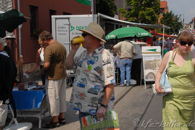 Der Veranstalter Golden Oldies ist stolz von abermals 70000 Zuschauer an 3 Tagen. Hier bei KFZ-Kultur.de sehen Sie 600 Bilder Fotos vom Samstag, den 26.7.2008 Vom 25. bis 27. Juli 2008 in Wettenberg 19. Festival Golden Oldies- Eine hessische Gemeinde auf Zeitreise in die Wirtschaftswunderzeit der 50er und 60er 3 Tage - 9 Bühnen - 50 Livebands - über 1.000 Oldtimer und 70.000 Besucher Musik & Motoren beim Festival Golden Oldies im Schatten der Burg Gleiberg Das mittelhessische Wettenberg wird zum 19. Mail für drei Tage „Deutschlands Hauptstadt der Oldiemusik“. Auf 9 Bühnen präsentieren rund 50 Musikgruppen Schlager, Beat, Soul, und Rock’n’Roll im Schatten der Burg Gleiberg. Eine atemberaubende Zeitreise in die 50er, 60er und 70er Jahre mit Deutschlands größter Oldtimer-Show. Das Motto in diesem Jahr: „Familie, Fortschritt & Souvenirs“ Das Festival hat Kultstatus und gehört zu den TOP Oldtimer Veranstaltungen in der Bundesrepublik. Was vor 18 Jahren mit nur 8 Bands, vier Bühnen und rund 3.000 begeisterten Fans begann, wurde inzwischen von der Fachpresse zu „Deutschlands schönster Oldiefete“ nominiert. Knapp 70.000 Besucher zählte das Festival im vergangenen Jahr. Mit Bus, Bahn und eigenem PKW reisen sie aus der gesamten Bundesrepublik und auch aus dem benachbarten Ausland an, um bei diesem Ereignis dabei zu sein. Golden Oldies bietet gleichermaßen Information und Unterhaltung zur Kulturgeschichte der vergangenen 50 Jahre. Von überregionalem Interesse ist bei Autoliebhabern die Ausstellung der rund 1.000 Klassikfahrzeuge am Sonntag, 27. Juli 2008 zu der private Fahrzeugbesitzer und über 50 Oldtimerclubs eingeladen sind.. Fahrzeuge, die zum Motto „Familie, Fortschritt Souvenirs“ passen, sind in diesem Jahr besonders gern gesehen, denn ihnen wird dieses Mal besondere Aufmerksamkeit gewidmet. Wiedersehen mit meinem ersten Auto: HEINRICH PUMPERNICKEL, alias Chris Howland. Er wird zum 19. Festival nach Wettenberg kommen, um ein Wiedersehen mit seinem 1. Auto zu feiern: Einem DKW 3=6, 2 türig fuhr "Mr. Pumpernickel" in den 50er Jahren Das Programm wird abgerundet durch zahlreiche Aktionen, Ausstellungen, ein umfangreiches Kinderprogramm und durch Deutschlands größten „Nostalgie Markt der 50er Jahre“. In rund 100 Verkaufsständen wird Originalware der sogenannten „Wirtschaftswunderzeit“ angeboten. Petticoats, Tulpenlampen, Schallplatten und Jukeboxen stehen in der Hauptstraße und in der Mehrzweckhalle zum Verkauf. Das Rockmuseum von Maria und Wolfgang Thomas stellt in der Mehrzweckhalle einen Querschnitt aus der Gesamtsammlung aus. Cruising der besonderen Art: Kinderwagen-Parade! Auf vier Rädern, 1 Fahrer(in) und meist nur mit einem Mitfahrer "belegt"... Am Samstag, dem 26. Juli 2008 gibt es ein Cruising der besonderen Art: Der Kostümverleih "Wundertüte" lädt ein, sich im Outfit der 50er/60er und mit einem Kinderwagen dieser Epoche zum Festivals Golden Oldies zu präsentieren und der „Deutsche Petticoat-Wettbewerb“ lädt alle Besucher des Festivals zu einer Zusammenkunft im Outfit der 50er bis 70er Jahre ein. Zusammengestellt wird das Festival von der Peter Turczak eventeam GmbH & Co KG. Unterstützt wird das Festival Golden Oldies von der Bitburger Brauerei, Neils & Kraft Mercedes Partner der Daimler-Chrysler AG, der Deutschen Bahn AG und der SFinanzgruppe Hessen-Thüringen. Nähere Informationen unter www.Golden-Oldies.de oder direkt bei der Gemeinde Wettenberg, 35435 Wettenberg, Telefon: 06 4 1 – 8 04 62